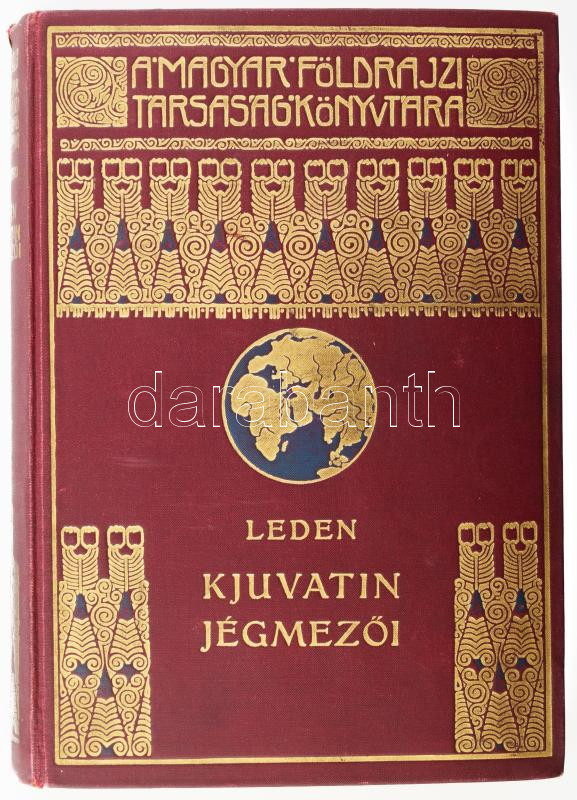 [Leden, Christian (1892-1957)] K. Leden: Kjuvatin jégmezői. Magyar Földrajzi Társaság Könyvtára. Ford.: Mihalik László. Bp.,[1930], Lampel R. (Wodianer F. és Fiai), 1 t.+244 p.+16 t. (fekete-fehér fotók)+ 1 (kihajtható térkép) t. Gazdag szövegközi és egészoldalas, fekete-fehér képanyaggal illusztrált. Kiadói dúsan aranyozott egészvászon sorozatkötésben, gerincen kisebb sérülések, kopásnyomok, kopottas állapotban.