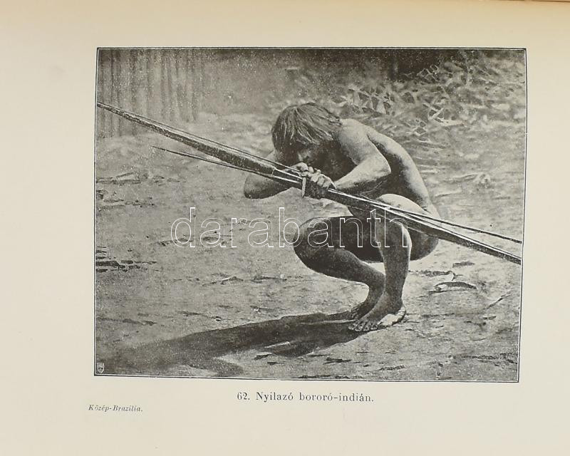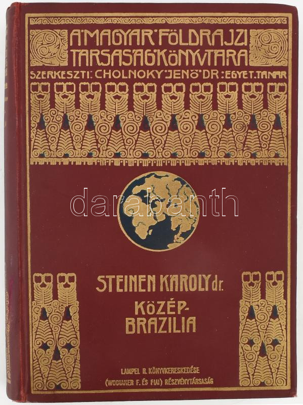 dr. Steinen Károly: Közép-Brazília természeti népei között. A második Xingú-expedició (1887-1888) útjának vázolása és eredményei. 63 képpel, 3 térképpel. Fordította: dr. Bátky Zsigmond. Magyar Földrajzi Társaság Könyvtára. Bp.,é.n. (cca 1920?), Lampel R. (Wodianer F. és Fiai) Rt., Franklin, 240 p. +8 (fekete-fehér fotók) t. +3 (térkép) t. Egészoldalas és szövegközti illusztrációkkal, fekete-fehér fotókkal, térképekkel illusztrált. Kiadói dúsan aranyozott egészvászon kötés, gerincén és kötéstáblák sarkain kopásnyomokkal, hátsó kötéstábla alján folttal.