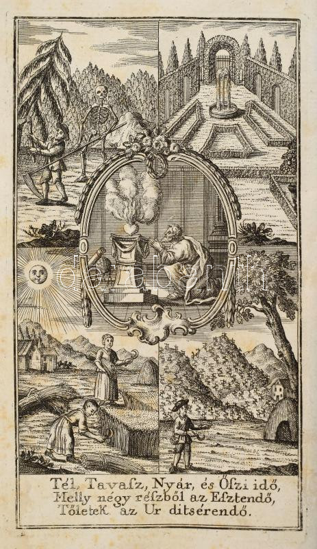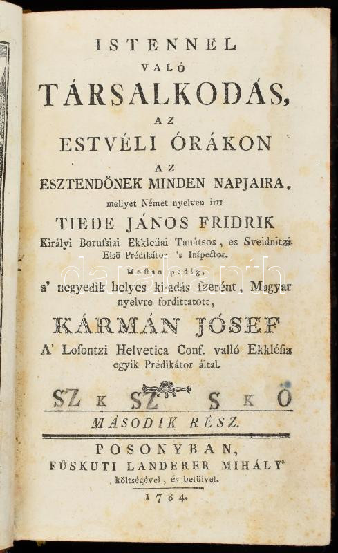 Tiede, Johann Friedrich: Istennel való társalkodás, az estvéli reggeli órákon az esztendőnek minden napjaira Posonyban, 1784, Füskuti Landerer Mihály költségével, és betűivel. címlapkép (Weinmann Márkus metszete), 1 t, 1 sztl. lev., XXIV. 2 sztl lev.. 684 p., 2 sztl. lev. id. Kármán József fordításában. Korabeli bordázott bőrkötésben.