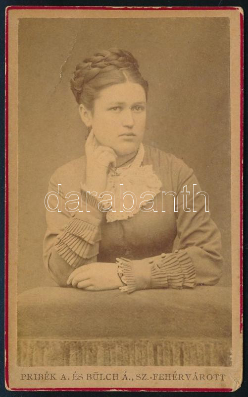 cca 1880-81 Fiatal hölgy portréja, keményhátú fotó Pribék A. és Bülch székesfehérvári műterméből, hátoldalán nevesített és datált (Steiner Julcsa, Julius 22., 1880. Nagykanizsa, 1881), felületi apró törésnyommal, szélein kopott. 10,5x6,5 cm