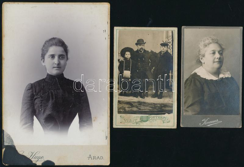 Beschreibung: cca 1890-1910 Keményhátú portrék aradi, brassói, temesvári műtermekből, egyik foltos, 10,5×6,5 és 17×11,5 cm-es méretben