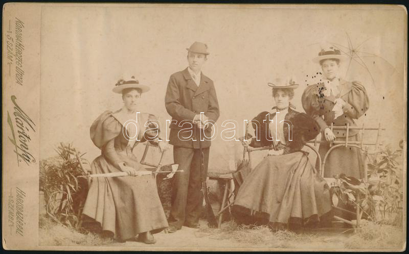 cca 1900 Fiatalember puskával hölgyek társaságában, keményhátú fotó Má... https://www.darabanth.com/de/474-Fernauktion/474.0/Fotografie/Foto~500023/cca-1900-Fiatalember-puskaval-holgyek-tarsasagaban-kemenyhatu-foto-Martonfy-budapesti-muermebol-~II3216457