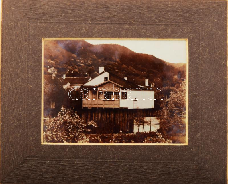Beschreibung: cca 1910 Körmöcbánya városrészlet, a háttérben a Stósz-hegy, hátoldalon feliratozott fotó (Kilátás lakásom ablakából Kbánya), paszpartuban, 8,5×11 cm