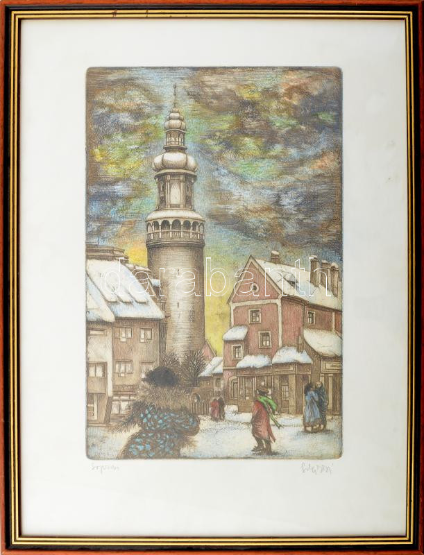 Beschreibung: Sulyok Gabriella (1939-): Sopron. Színezett rézkarc, papír, jelzett. Üvegezett, fakeretben,29x19 cm