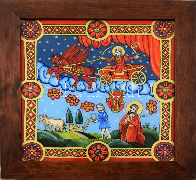 Illés próféta mennybemenetele kabátját Elizeusnak adja át, a bnös emberi nemet jelképező Ádámmal, a virágok a Paradicsom boldogságát jelképezik. Üvegikon, Erdély, füzesmikolai (Nicula, Ro) ikon iskola. Fa keretben 27x28 cm