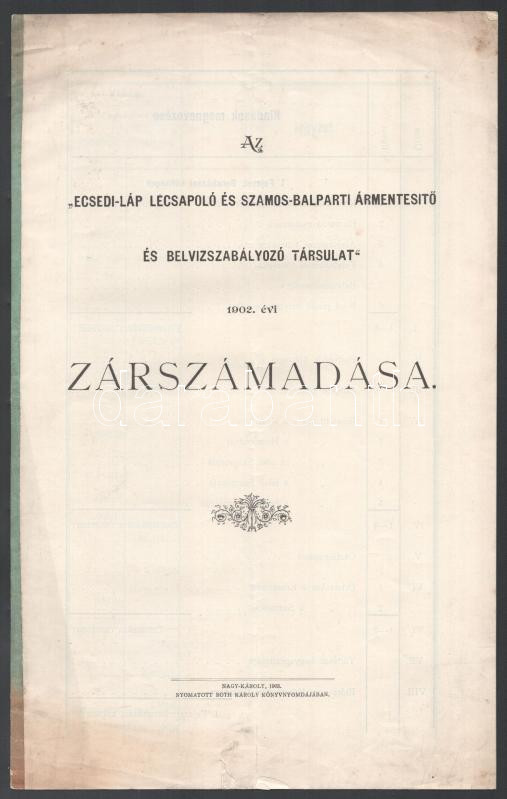 1903 Az ,,Ecsedi-láp lecsapoló és Szamos-balparti ármentesítő és belvízszabályozó társulat" 1902. évi zárszámadása. Nagykároly, 1903, Róth Károly-ny., 10+(2) p. Kiadói tűzött papírkötés, kissé sérült, foltos.