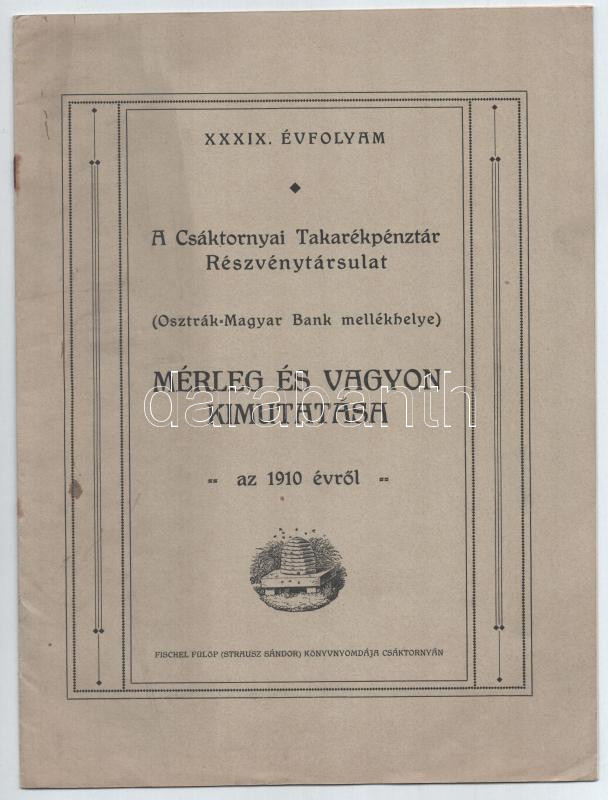 1911 A Csáktornyai Takarékpénztár Rt. (Osztrák-Magyar Bank mellékhelye) mérleg és vagyon kimutatása az 1910. évről. XXXIX. évfolyam. Csáktornya, Fischel Fülöp (Strausz Sándor)-ny., 12 p. Kiadói tűzött papírkötés.