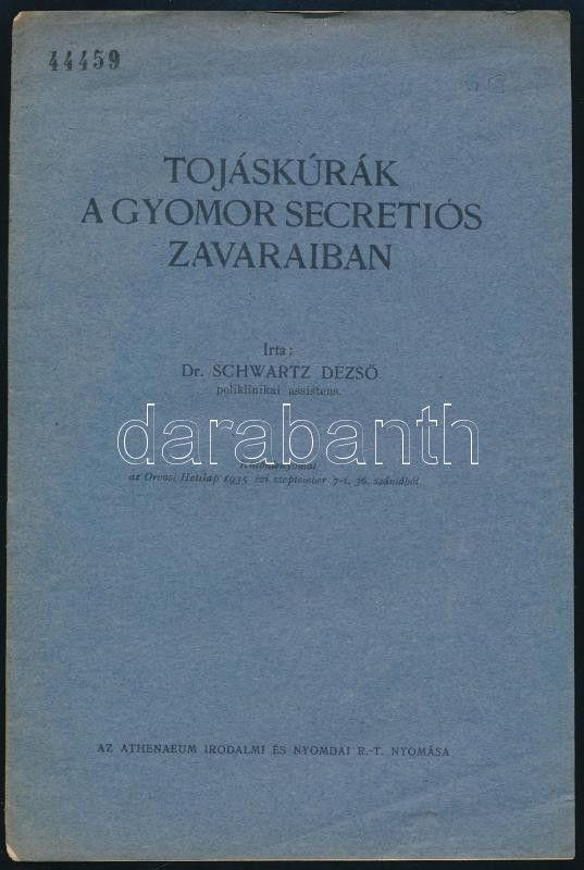 1935 Dr. Schwartz Dezső: Tojáskúrák a gyomor secretiós zavaraiban, kül... https://www.darabanth.com/de/474-Fernauktion/474.0/Kunst-Dokumente-andere-Sammelgebiete/Drucksachen~1000023/1935-Dr-Schwartz-Dezso-Tojaskurak-a-gyomor-secretios-zavaraiban-kulonlenyomat-3p~II3217521