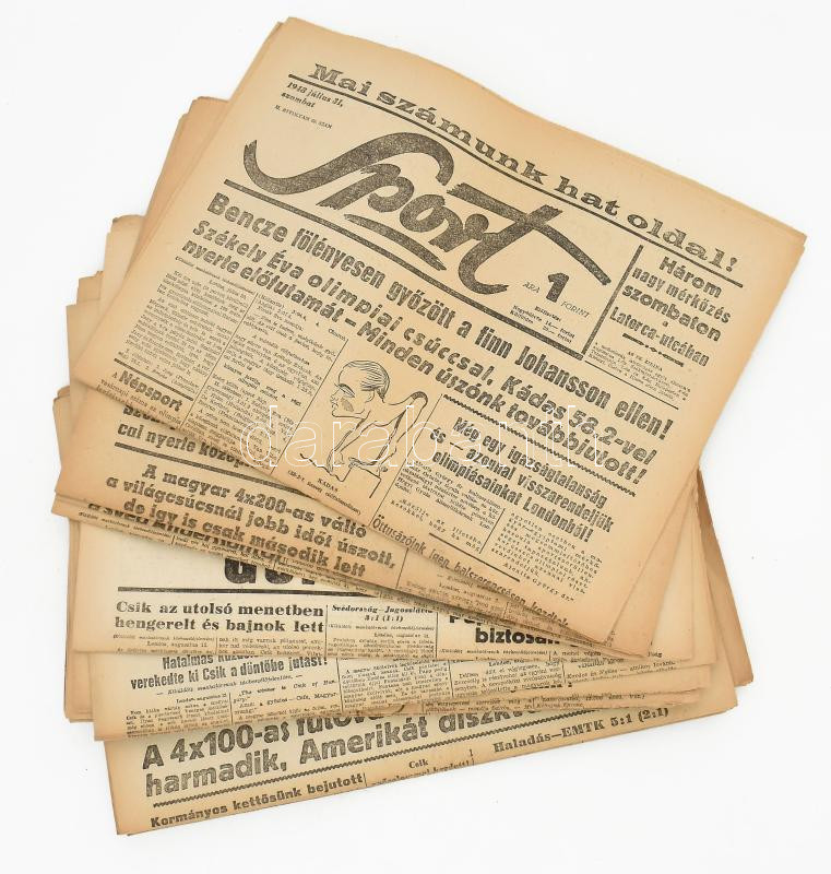 1948 Londoni olimpiáról szóló újság gyűjtemény: Népsport 1948. júl. 30-aug. 15., IV. évf. 150-159,161. számai és Sport 1948. júl. 31., aug. 4., 7.,11., 14., II. évf. 60-64. számai. Összesen 11+5 szám. Változó állapotban, közte szakadt is, hajtottak.