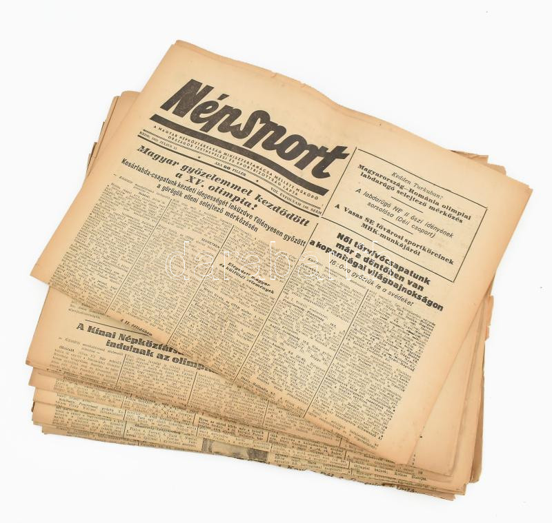 1952 Népsport 19 száma: 1952. jul. 15 - aug. 10.,VIII. évf. 140-163. Bennük a XV. nyári olimpiai játékok, a helsinki olimpia híreivel. Köztük a Keleti Ágnes, Szőke Kató, Székely Éva úszók, kardvívó-csapat, az Aranycsapat és vízilabdacsapat, Papp László ökölvívó aranyérmeinek híreivel. Változó állapotban, közte szakadt, foltos is, hajtottak.