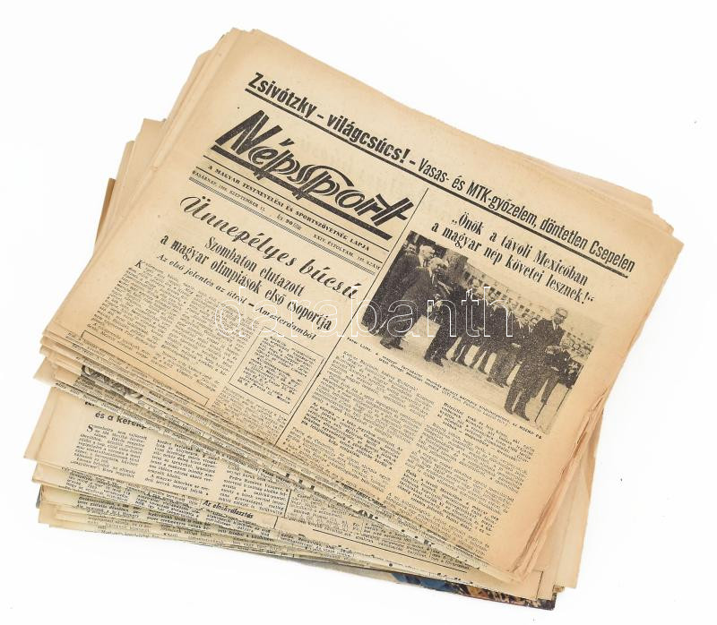 1968 Népsport 37 száma, 1968. szept. 15. - okt. 29., XXIV. évf. 182. - 220. számok. Bennük a XIX. nyári olimpiai játékok, a mexikóvárosi olimpia híreivel. Köztük az öttusa csapat, Hesz Mihály kajak, Tatai Tibor kenu, Kozma István birkózó, Zsivótzky Gyula kalapácsvető, labdarúgó válogatott, Kulcsár Győző és a férfi párbajtőr csapat aranyérmeinek híreivel. Változó állapotban, hajtottak. + 1970-1974 További három sportújság.