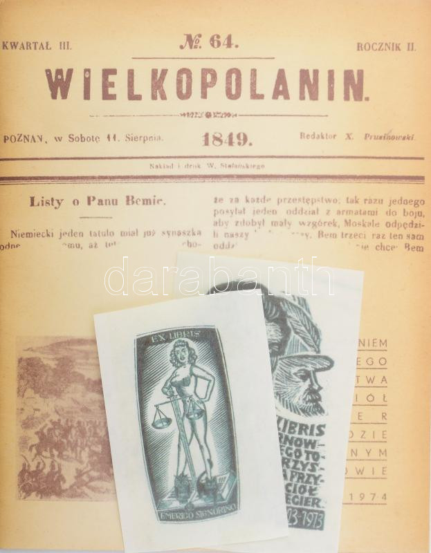 1973 Wielkopolanin 1849. A Tarnowi Magyarbarátok Társasága kiadványa az 1848-49-es forradalomról. Lengyel nyelven; lengyel és magyar nyelvű bevezetővel. Kiadói tűzött papírkötés, a hátsó borító kissé foltos. Megjelent 300 példányban (számozatlan). + 2 db ex libris