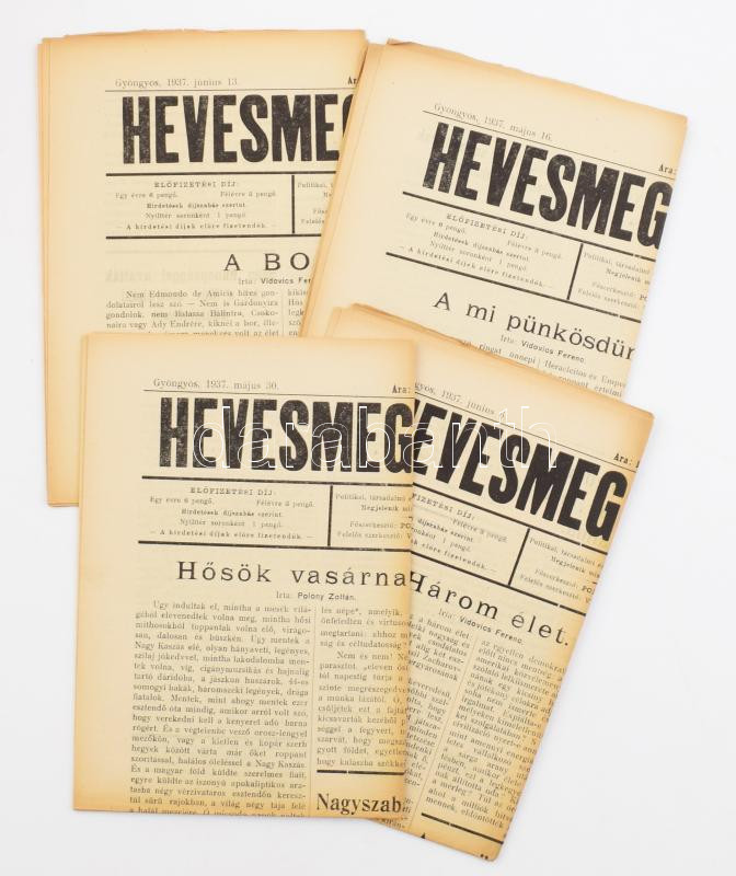 Hevesmegyei Lapok 1937. május 16-30, jún. 6-13., XLVI. évf. 20-24. sz. Főszerk.: Polóny Zoltán. Változó állapotban, közte szakadt, de többnyire jó állapotban, hajtott.