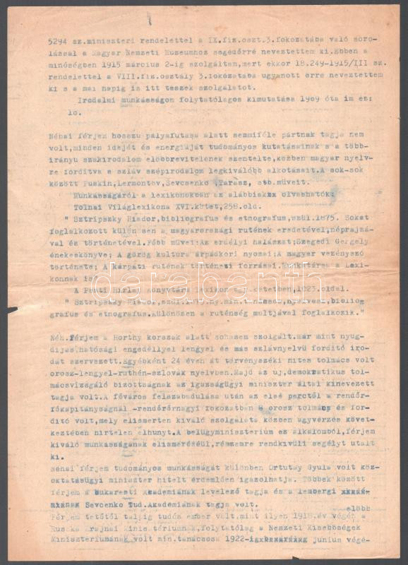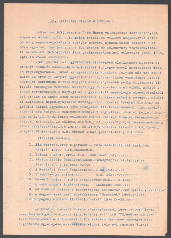 Beschreibung: cca 1930 Sztripszky Hiador (1875-1946.) ruszin származású magyar néprajzkutató, irodalomtörténész. gépelt önéletrajza két oldalon, a vége hiányzik