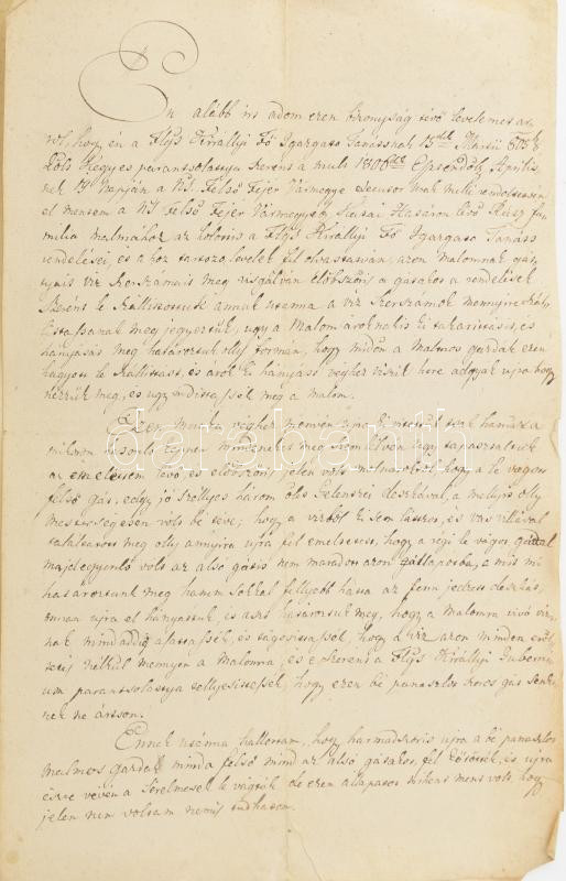 Beschreibung: 1805-1807 ,,A Flgs Királlyi Gubernium sententiaja [...] Tkes Sambler László urnak testimoniumával", a gubernium (fÅ‘kormányszék; Erdély legfÅ‘bb kormányhatósága) Ãtélete a FelsÅ‘-Fehér vármegyei Kanta (1849-tÅ‘l Kézdivásárhely része) határán található, a Rátz famÃlia birtokában lévÅ‘ malom ügyében, össz. 5 oldalon, magyar ill. latin nyelven. Kisebb ázásnyomokkal.