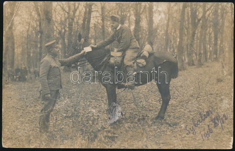 Beschreibung: 1916 Hummel Gyula őrnagy, később alezredes a 2 honvéd gyalogezred tagja, tábori postát vesz át a fronton
