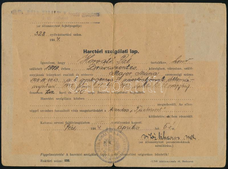 1944 Pécs, harctéri szolgálati lap a 8. gyalogezred I. zászlóaljának t... https://www.darabanth.com/de/474-Fernauktion/474.0/Kunst-Dokumente-andere-Sammelgebiete/Militaria~1000019/1944-Pecs-harcteri-szolgalati-lap-a-8-gyalogezred-I-zaszloaljanak-tartalekosa-reszere~II3219281