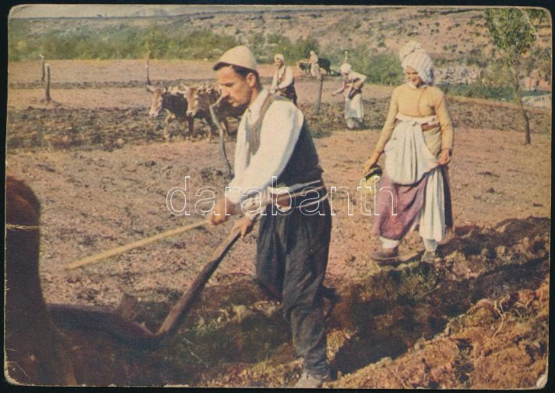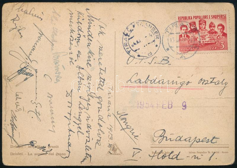 Dorogi Andor (1912-1989) nemzetközi labdarúgó-játékvezető autográf képeslapja Albániából, az albán-lengyel meccsre, / Autograph postcard of international football referee Andor Dorogi (1912-1989) from Albania, for the Albanian-Polish match