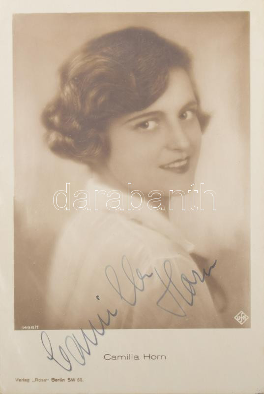 cca 1930 Camilla Horn (1903-1996) német táncos és színésznő, a néma- és hangosfilmek sztárjának autográf aláírása őt ábrázoló fotólapon, 14x9 cm / Autograph signature of Camilla Horn (1903-1996) German dancer and actress, film star of the silent and sound era, on a photo postcard