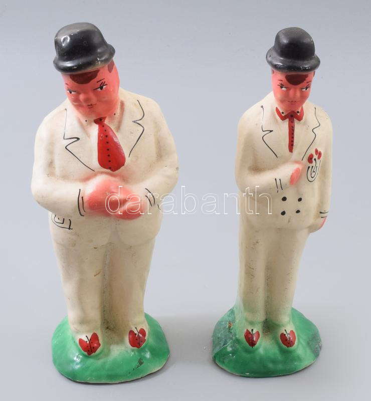 Stan és Pan, kézzel festett gipsz szobrok, jelzés nélkül, kisebb hibákkal, az egyik talpán javítással, m: 23 cm