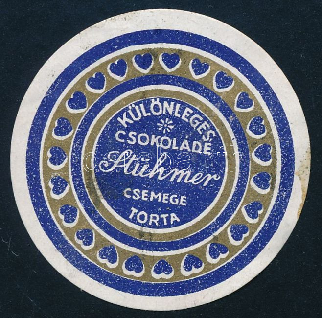 Stühmer csemege torta címke, d: 5,5 cm https://www.darabanth.com/de/474-Fernauktion/474.0/Kunst-Dokumente-andere-Sammelgebiete/Werbungen~1000005/Stuhmer-csemege-torta-cimke-d-5-5-cm~II3219991