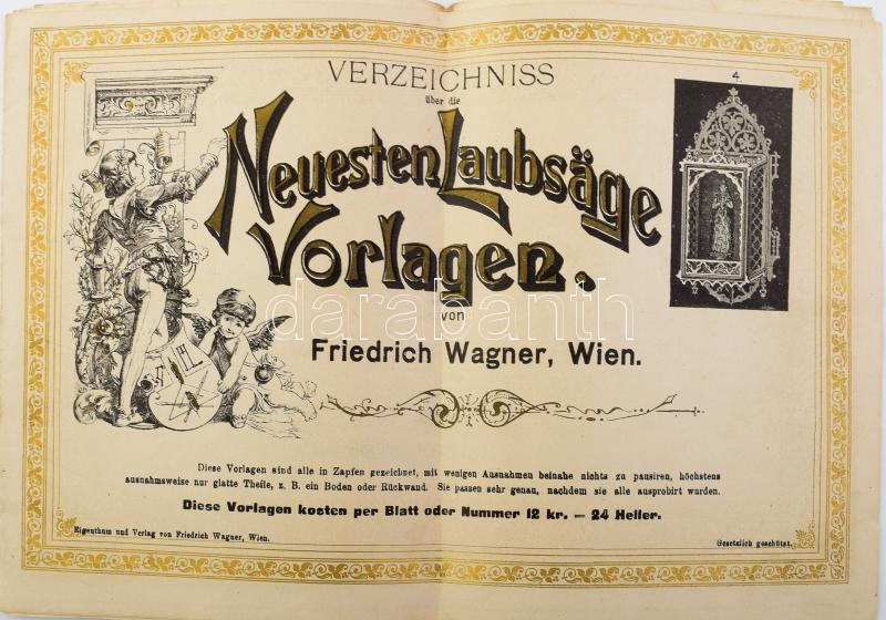 cca XIX utolsó harmada Verzeichnis über die Neuesten Laubsäge Vorlagen von Friedrich Wagner, Wien. [A legújabb lombfűrész-minták jegyzéke.] Wien, Friedrich Wagner, 14 p.+2 sztl. lev. Gazdag fekete-fehér képanyaggal illusztrált. Papírkötés, két lap kijár, hajtott.