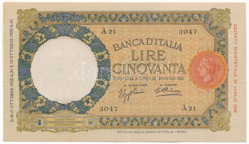Olaszország 1933. 50L T:VF kis beszakadás Italy 1933. 50 Lire C:VF sma... https://www.darabanth.com/de/474-Fernauktion/474.0/Numismatik/Weltweit-Banknoten~1500017/Olaszorszag-1933-50L-TVF-kis-beszakadas-Italy-1933-50-Lire-CVF-small-tear-Krause-P2354~II3220483