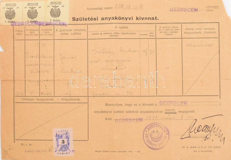 1949 Debrecen anyakönyvi kivonat 3x1ft városi és 3ft állami illetékbél... https://www.darabanth.com/de/474-Fernauktion/474.0/Philatelie-und-Postgeschichte-Ungarn/Stempelmarken~500019/1949-Debrecen-anyakonyvi-kivonat-3x1ft-varosi-es-3ft-allami-illetekbelyeggel~II3214797