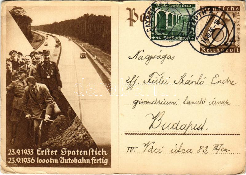 1933 Erster Spatenstich - 1936 1000 km Autobahn fertig / 1933 First Groundbreaking - 1936 1000 km highway completed. Adolf Hitler, NSDAP German Nazi Party propaganda. 6+4 Ga. (EB)