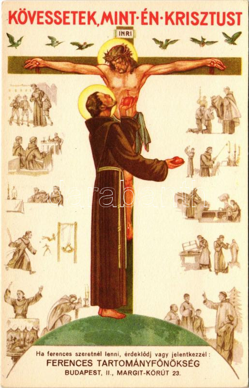 Kövessetek, mint én Krisztust. Ferences Tartományfőnökség toborzó reklámlapja. Budapest II. Margit körút 23. Klösz / Franciscan order's recruiting advertisement card (EK)