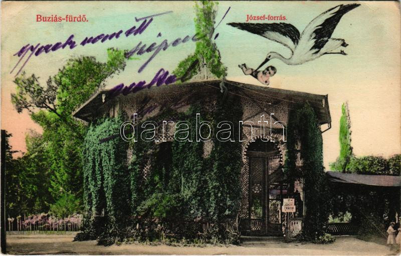 Beschreibung: 1908 Buziásfürdő, Baile Buzias; József-forrás, montázs gólyával és babával / spa, spring source. Montage with stork and baby (EK)