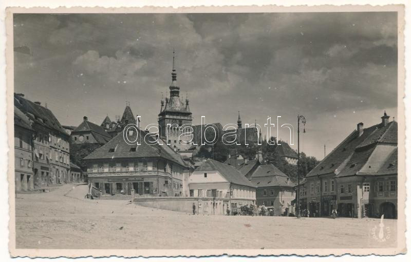 1939 Segesvár, Schässburg, Sighisoara; Városház torony, tér, parfüméria, Hans Roth üzlete / stown hall tower, square, shops, Foto original Fotofilm, photo