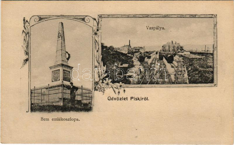 Piski, Simeria; Bem emlékoszlopa, vaspálya, vasútállomás, gőzmozdony, vonatok. Gyulai József kiadása, szecessziós-virágos keret / monument, railway station, locomotive, train. Art Nouveau, floral