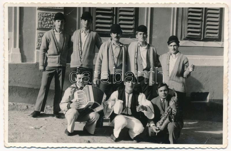 Polyán, Poiana Sibiului, Flussau (Szeben); erdélyi folklór, férfiak harmonikával és szaxofonnal / Transylvanian folklore, men with accordion and saxophone. Mircea Juga photo (non PC) (fa)