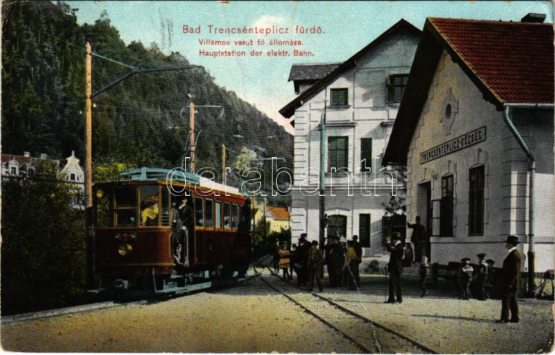 1910 Trencsénteplic, Trencianske Teplice; Villamos vasút főállomása, vasútállomás. Kiadja Wertheim Zsigmond / Hauptstation der elektrischen Bahn / tram station, tramways, railway station (fa)