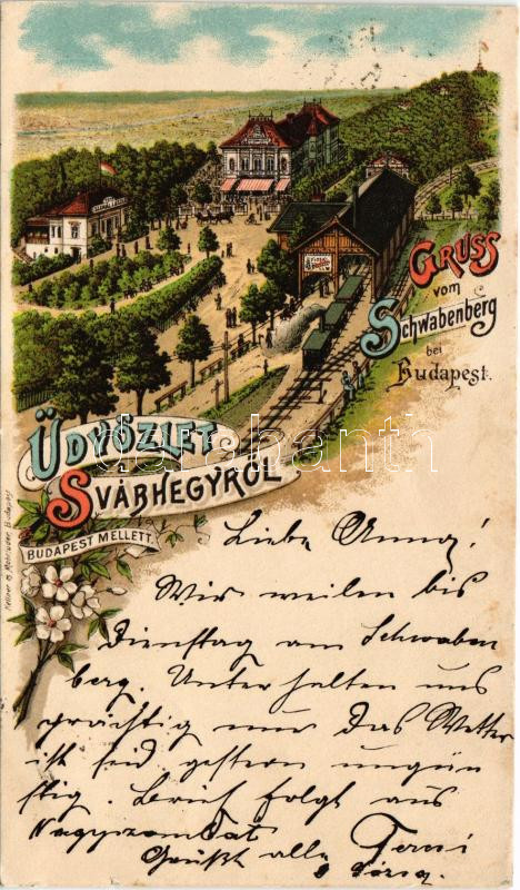 1898 (Vorläufer) Budapest XII. Svábhegy, Fogaskerekű vasút végállomása, vasútállomás, szálloda, Szakál László üzlete. Kellner & Mohrlüder Art Nouveau, floral, litho (vágott / cut)