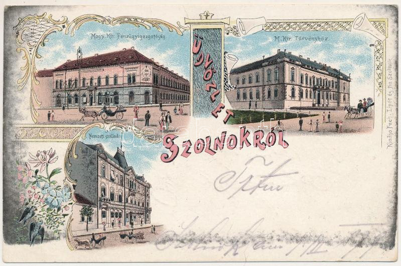 Beschreibung: 1899 (Vorläufer) Szolnok, Magy. kir. pénzügyigazgatóság, törvényház, Nemzeti szálloda. Fuchs Lipót kiadása, Art Nouveau, floral, litho