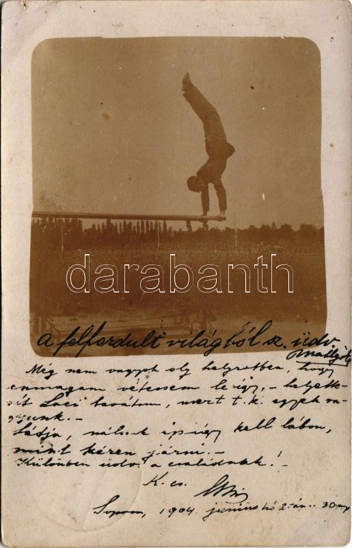 Beschreibung: 1904 Sopron, katonatiszt akrobatikus mutatvány közben. photo (apró szakadás / tiny tear)