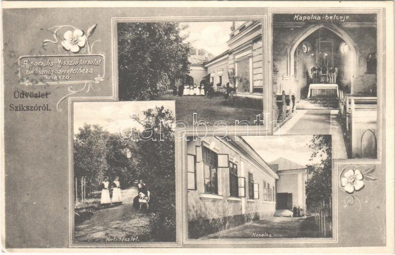 Beschreibung: 1912 Szikszó, a Szociális Missziótársulat Bethánia szeretetháza, kerti részlet, udvar, kápolna, belső. Stamberger Márk kiadása. Art Nouveau, floral (EK)