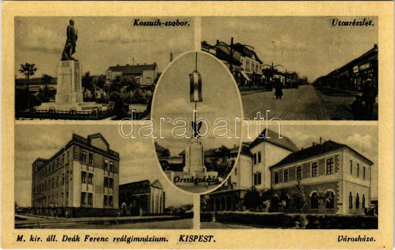 Beschreibung: Budapest XIX. Kispest, Kossuth szobor, utca részlet, üzletek, Országzászló, M. kir. állami Deák Ferenc reálgimnázium, Városháza