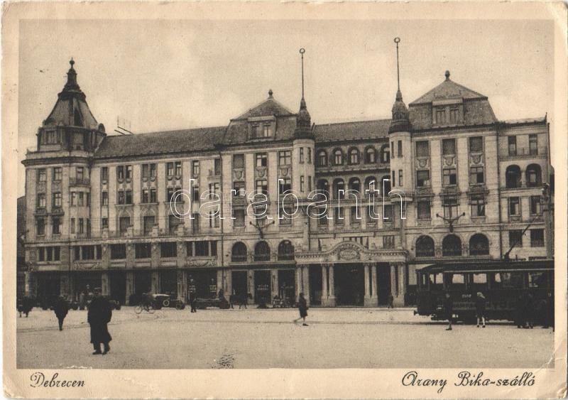 Debrecen, Arany Bika szálló, villamos (EB) https://www.darabanth.com/de/475-Fernauktion/475.0/Ansichtskarten/Ungarn~1500005/Debrecen-Arany-Bika-szallo-villamos-EB~II2083622