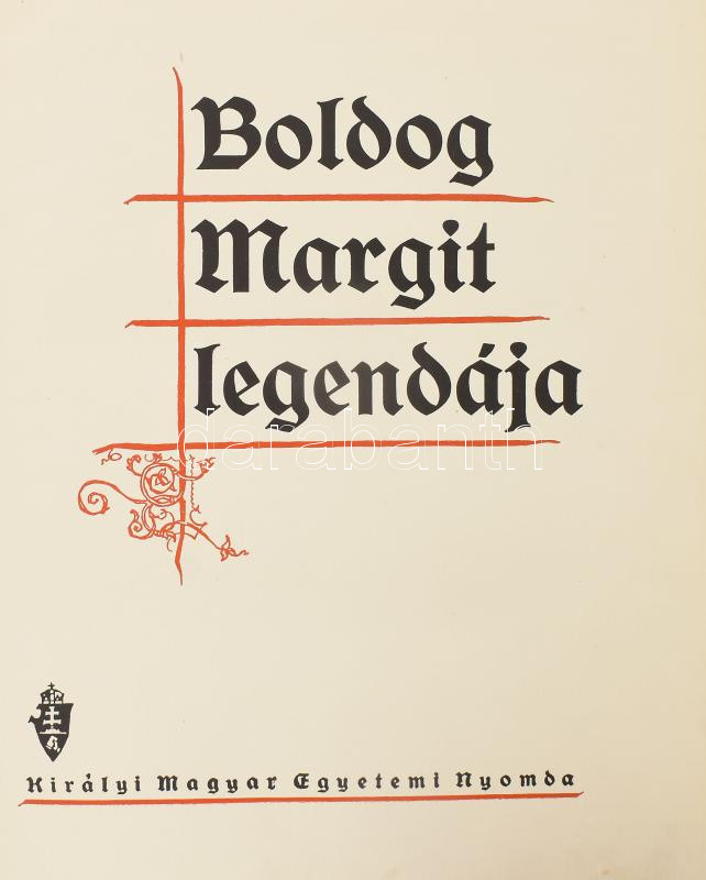 Baros Gyula: Boldog Margit Legendája. P. Böle Kornél előszavával. Minárné Techert Anna illusztrációival. Bp., [1938], Kir. M. Egyetemi Nyomda, 218+2 p. +10 t. Kiadói félpergamen-kötés, kissé foltos, kissé kopott borítóval.