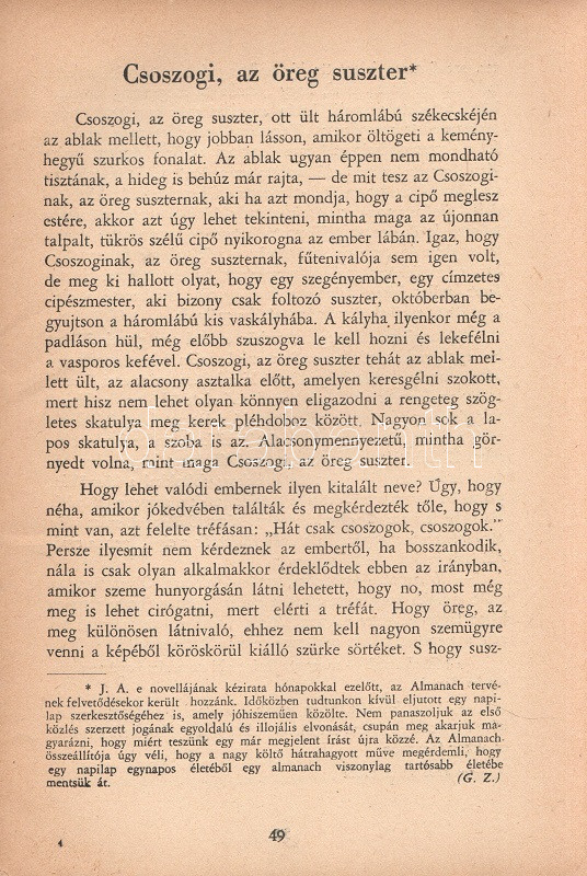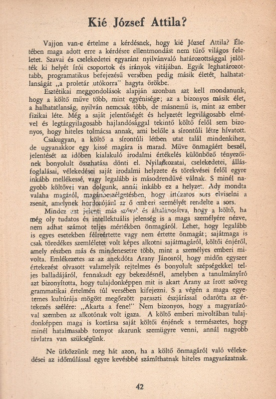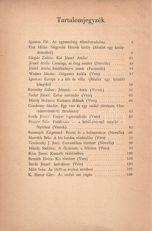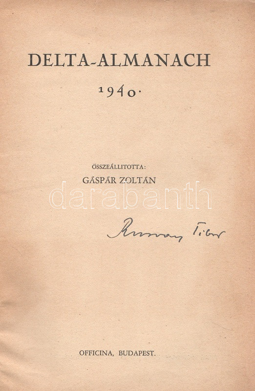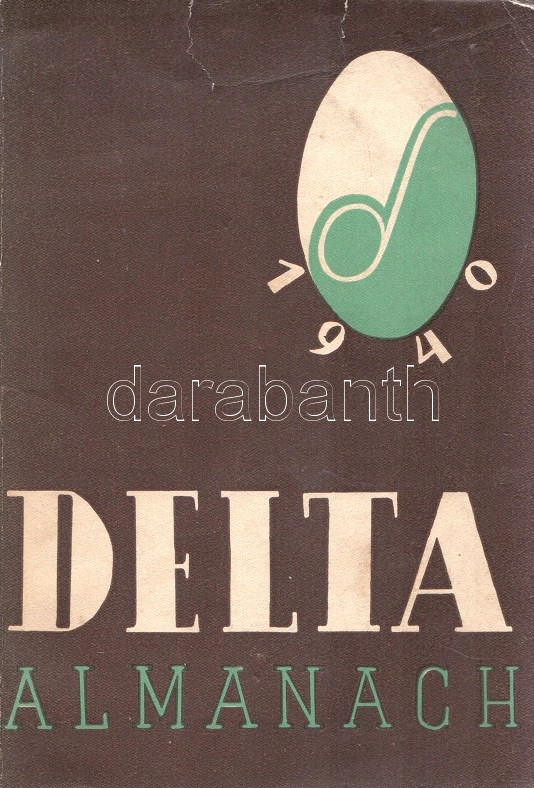 Delta-almanach 1940. Összeállította: Gáspár Zoltán. Budapest, 1940. Officina Kft. (ny.) 111 + [1] p. A Delta-almanach szerzőgárdája az 1936-1939 között megjelent társadalomtudományi és szépirodalmi lap, a József Attila, Ignotus Pál és Fejtő Ferenc által szerkesztett Szép Szó munkatársaiból állt össze. A városi baloldal lapja, a Szép Szó a vonatkozó sajtórendelet értelmében 1939-ben ellehetetlenült, munkatársai egy része emigrációba kényszerült, egy részük viszont közösen jegyezte a Delta-almanachot, melynek végül csupán egyetlen száma jelent meg. A tartalomból: Ignotus Pál: Az egyszerűség ellenforradalma - Gáspár Zoltán: Kié József Attila? - József Attila: Csoszogi, az üreg suszter - Weöres Sándor: Gilgames halála - Tersánszky J. Jenő: Fantasztikus történet - Kósa János: Kossuth védelmében - Máté Iván: Az 1920-as évjárat nevében - Ignotus: Európa s a kés és villa - K. Havas Géza: Az utolsó szó jogán. A címlapon régi tulajdonosi bejegyzés, példányunk fűzése enyhén meglazult. Madár 0. Poss.: Rusvay Tibor. [Rusvay Tibor (1926-2000) tatabányai, ceglédi és váci gimnáziumi tanár, váci helytörténész, a Váci Múzeum Egyesület titkára.] Fűzve, színes, illusztrált, enyhén sérült kiadói borítóban.
