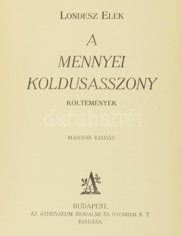 Londesz Elek: A mennyei koldusasszony. Petúr László (1904-1975) írónak dedikált. Bp., Athenaeum. Kiadói egészvászon kötés, belül a gerincnél szakadt, kissé kopottas állapotban.