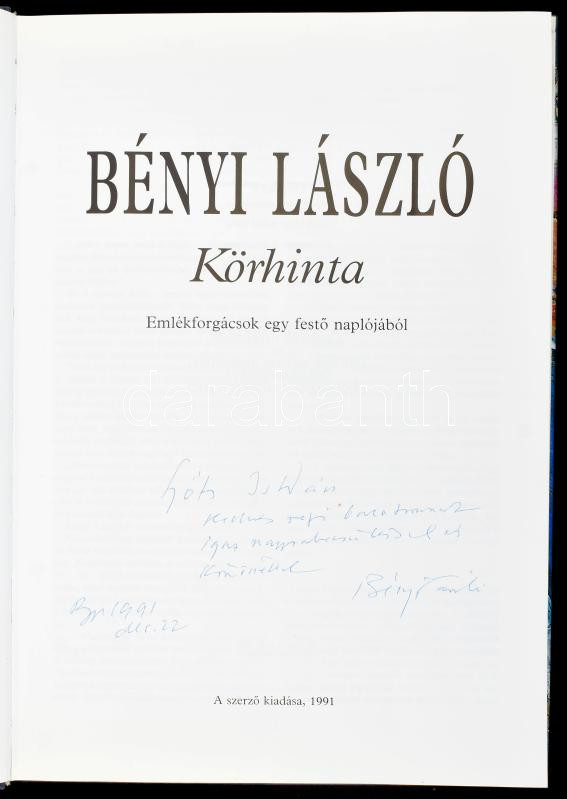 Bényi László: Körhinta. Emlékforgácsok egy festő naplójából. DEDIKÁLT! 1991, Szerző. Megjelent 3000 példányban. Kiadói egészvászon kötés, papír védőborítóval, jó állapotban.