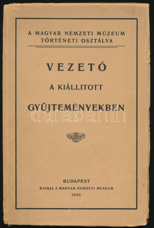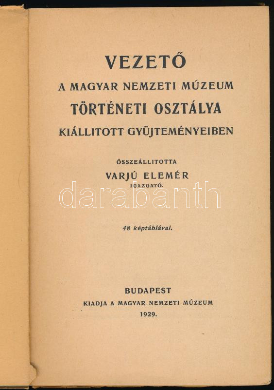 Vezető a Magyar Nemzeti Múzeum történeti osztálya kiállított gyűjteményeiben. Összeáll.: Varjú Elemér. Bp., 1929, Magyar Nemzeti Múzeum, 87+(1) p.+ IV p.+ XLVIII (fekete-fehér fotók) t. Kiadói papírkötés, kissé sérült borítóval, belül jó állapotban, a szövegben néhány beragasztott korrekcióval.