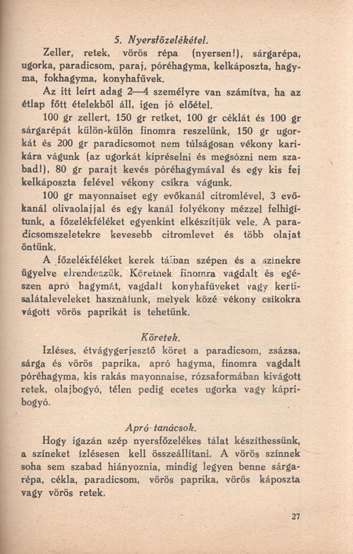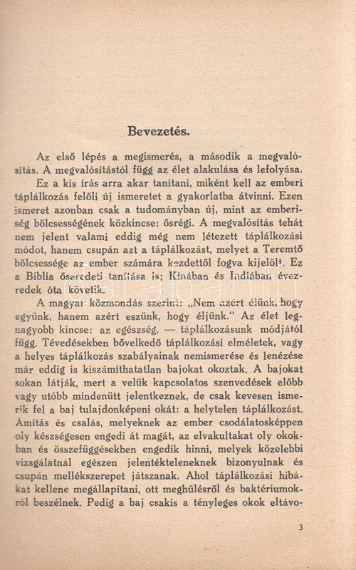 Bircher-Benner, Maximilan - Birchner, Max Edwin: Gyümölcsételek és nyersfÅ‘zelékek. A táplálkozás, mint természetes gyógytényezÅ‘. Budapest, [1941]. Novák Rudolf és Társa Tudományos Könyvkiadóvállalat (Gyarmati és BÅ‘sz ny.) 45 + [3] p. Maximilian Birchner-Benner (1867-1939) svájci orvos és dietetikus, a teljes értékű táplálkozás úttörÅ‘je, elsÅ‘ként ismerte fel az élelmiszeripari eljárások káros hatásait, illetve kritizálta a pusztán kalória-elemzésre szorÃtkozó diétázást. A vÃzkúrát és a dietetikát tanulmányozó Birchner késÅ‘bb Svájcban magánklinikát nyitott, mely az egészséges táplálkozás és a sok mozgás kiváltotta méregtelenÃtés elvein alapult. TisztelÅ‘i és páciensei közé olyan hÃres személyek tartoztak, mint Rainer Maria Rilke, Hermann Hesse, Mahátma Gandhi és Thomas Mann (utóbbi a Birchner-klinikán szerzett élményeit felhasználta ,,A varázshegy" cÃmű regényéhez). A neves dietetikai és természetgyógyászati szakember dolgozata elsÅ‘sorban a nyers gyümölcs- és zöldségfogyasztás fontossága mellett érvel, a kötet ételreceptjeinek többségét a szerzÅ‘ fia, a szintén orvosként dolgozó Max Edwin Birchner Ãrta. A mű elsÅ‘ magyar fordÃtása 1934-ben jelent meg, példányunk a második, javÃtott kiadásból való. Horváth 135. Fűzve, enyhén sérült, enyhén foltos kiadói borÃtóban.