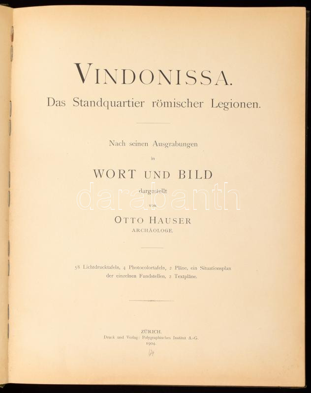 Beschreibung: Hauser, O.:Vindonissa. Das Standquartier römischer Legionen. Nach seinen Ausgrabungen in Wort und Bild.