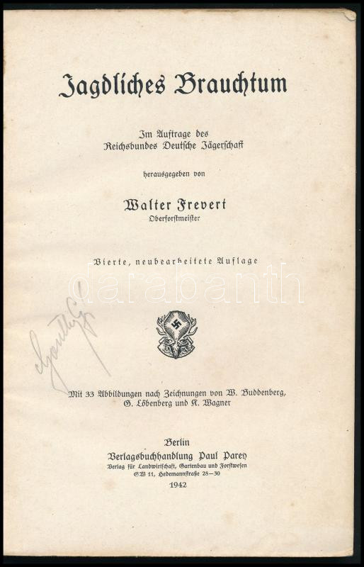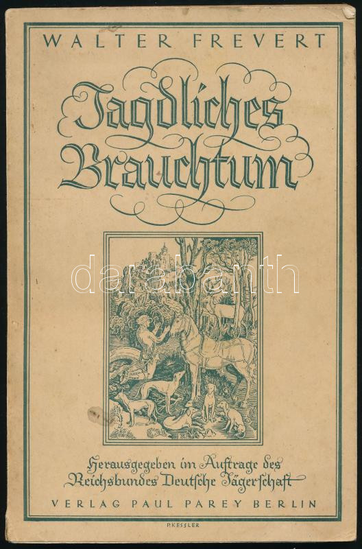 Frevert, Walter: Jagdliches Brauchtum. Gosztonyi Géza országos fővadász névbejegyzésével. Berlin, Verlag Paul Parey. Kiadói papírkötés, gerinc kissé sérült, kopottas állapotban.