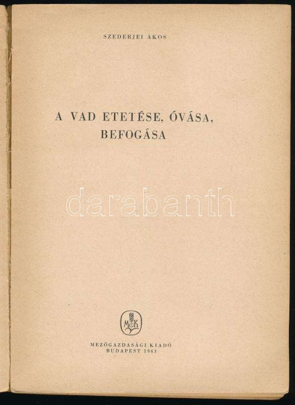 Szederjei Ákos: A vad etetése, óvása, befogása. Bp.,1963, Mezőgazdasági, 198+2 p.+ XLIV (fekete-fehér képtáblák) t.Kiadói papírkötés, kopott borítóval, kissé sérült gerinccel és kötéssel, bejelölésekkel és aláhúzásokkal. Megjelent 2200 példányban.